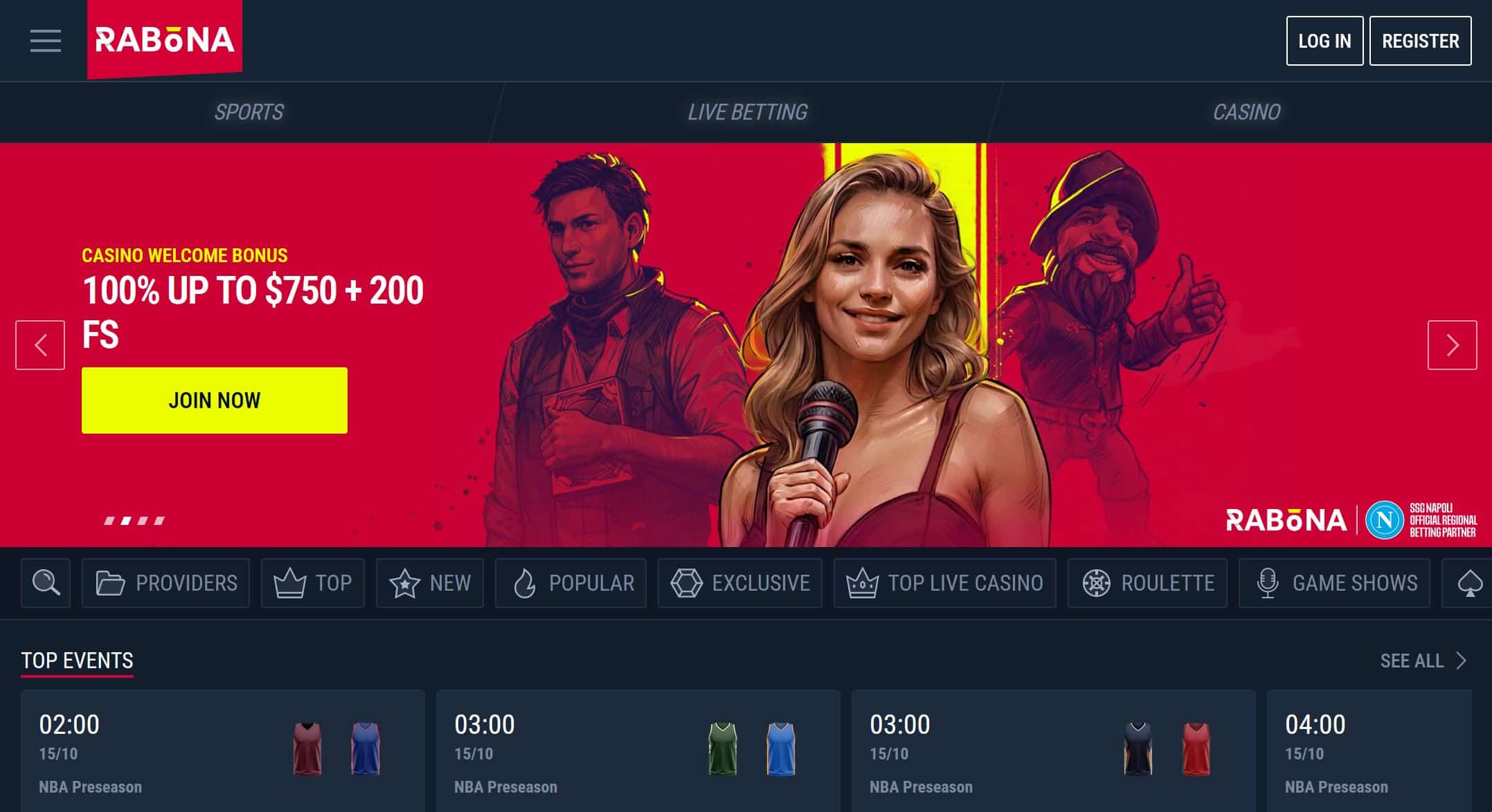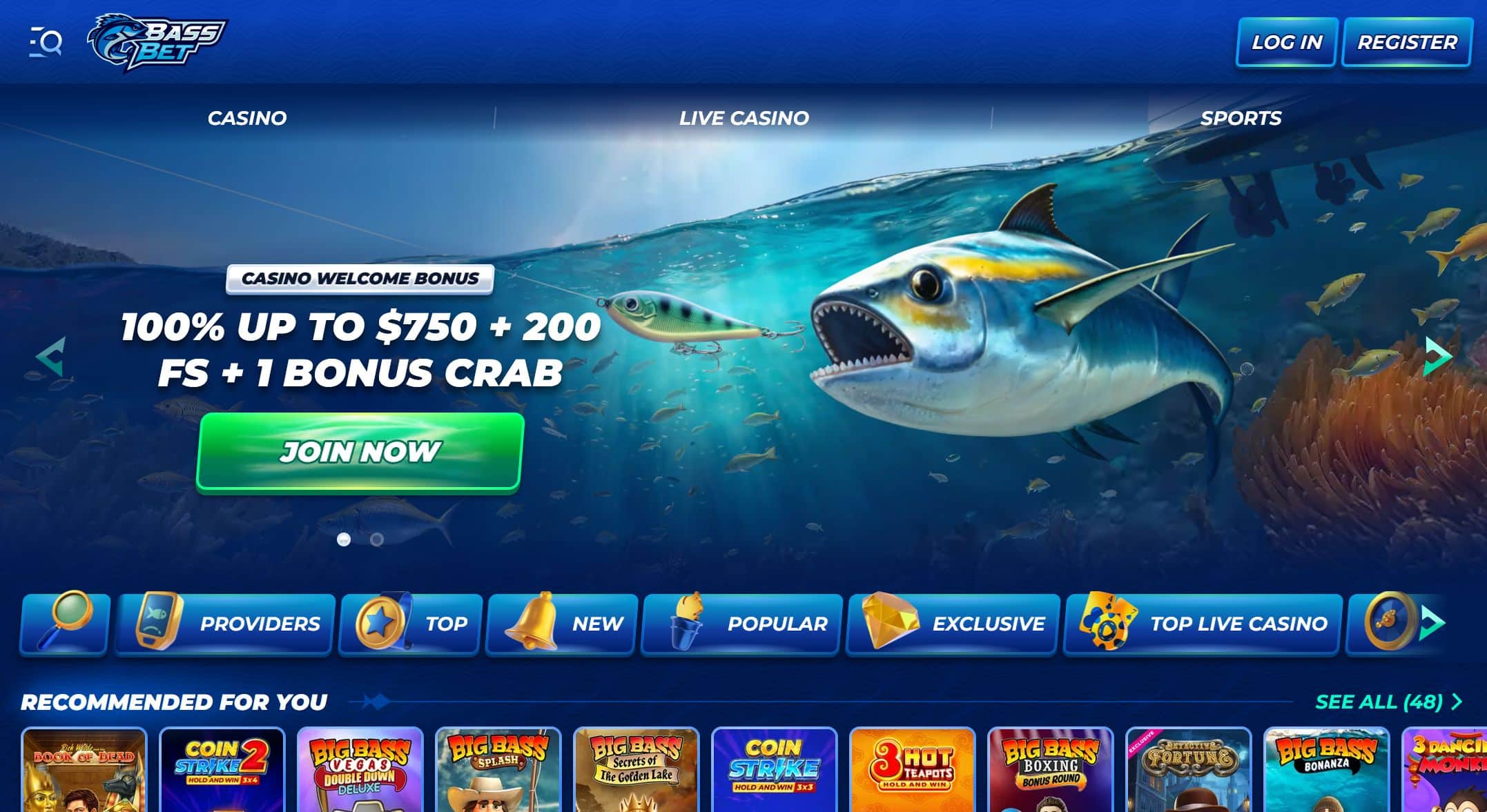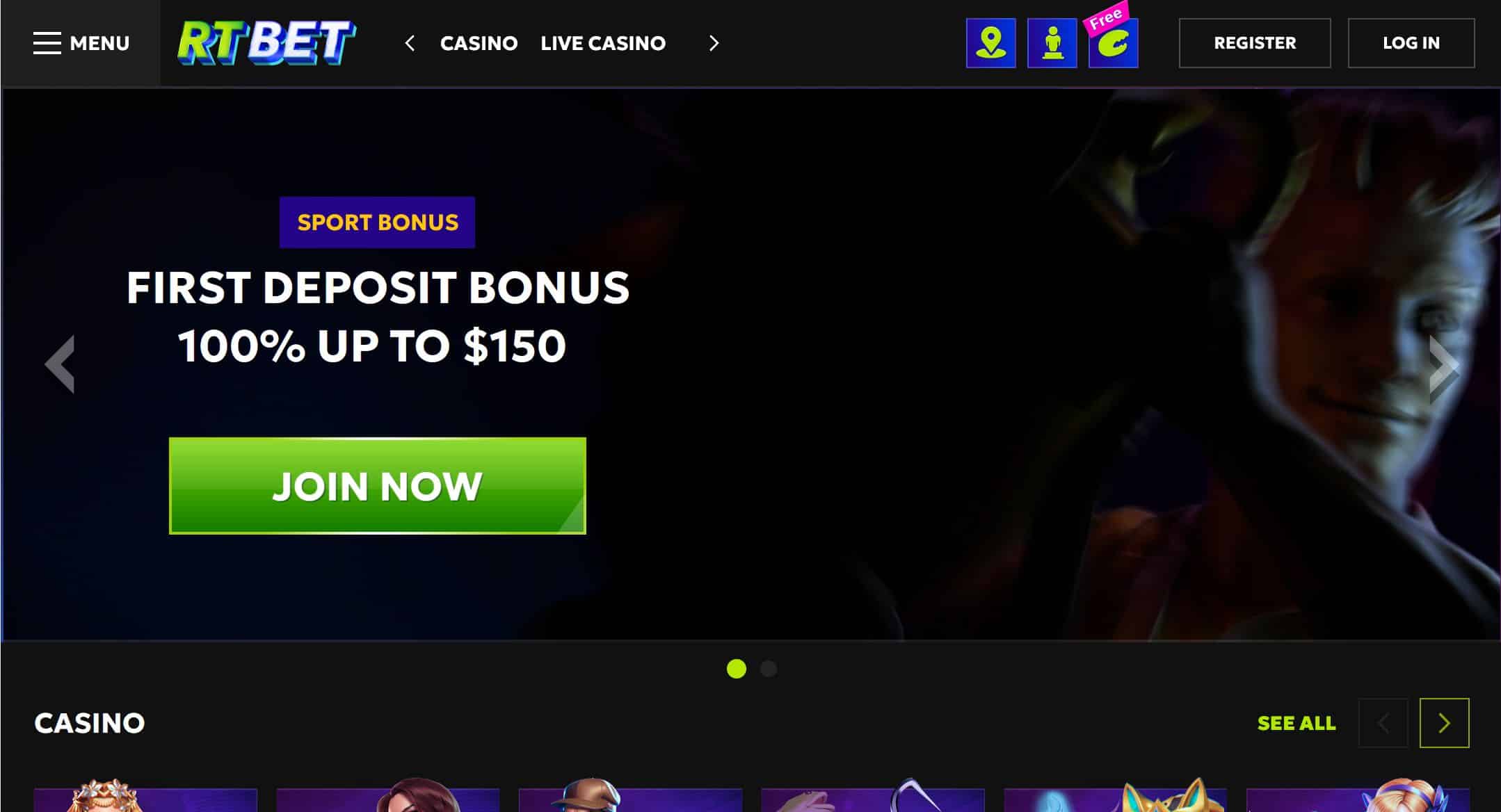 • Full casino section with slots and live dealers
